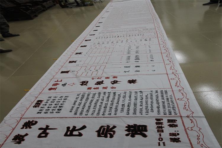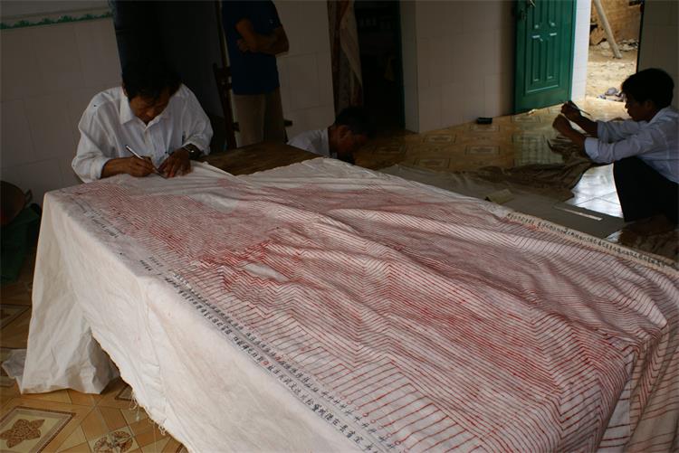 在海南省昌江黎族自治县,有一个全省最大的黎族村庄——峨港村,全村人口11000多人。这里世代居住着操美孚方言的黎族百姓,经济生活以农耕为主。据了解,全村共有20多个姓氏,较大的姓氏有王、符、叶、张等。这个村的家谱世系图都采用在白布上书写的方式,有宝塔式,也有欧式(横写)。当一块布料写完时,又接上另一块白布,家族的大小从布块的大小就一目了然。一般12年修一次谱,家谱都存放在族中较有威望的长者家中。据省博物馆专家说,这是目前唯一一个在布上书写家谱的村庄,对研究当地的历史文化具有重要的。