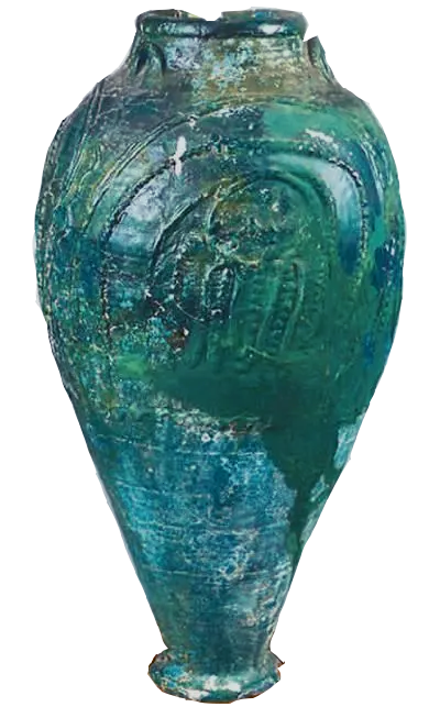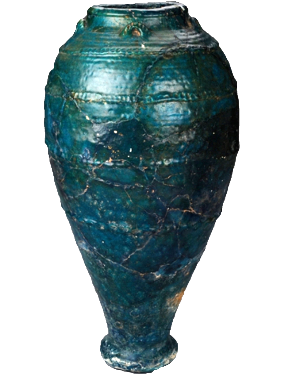根据专家多方考证,认定孔雀蓝釉瓶是中西亚古代波斯(即今天的伊朗)的产品。古代波斯素以制陶著称,在波斯当地这一类器皿常用来盛油并深埋于墓室内点灯,俗称“长明灯”。