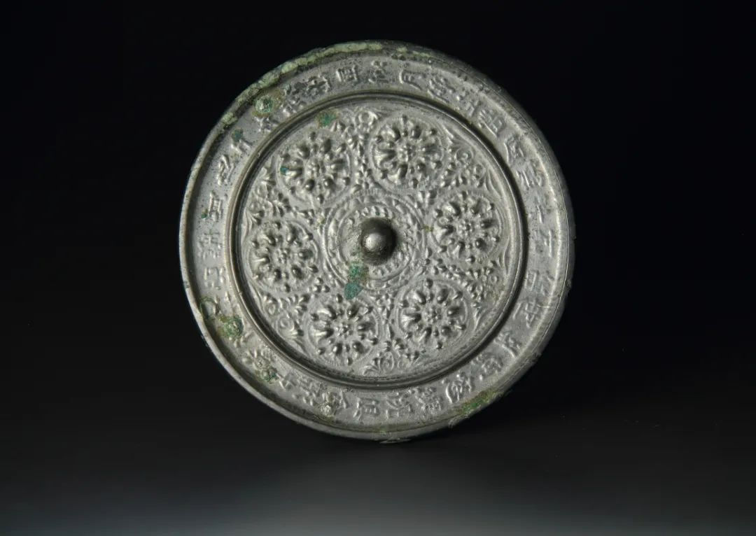 圆形,圆钮,一周凸弦纹将镜背分为内外区,内区饰六组莲花纹,外区为一圈铭文带。铭曰“练影神怡,莹质良工,如珠出匣,似月停空,当眉写翠,对脸傅红,绮窗绣晃,俱含影中”。