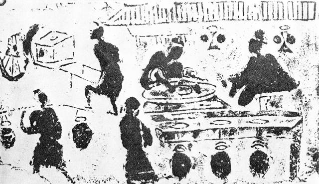 最早我们的祖先是把粮食蒸成饭、煮成粥或炒成干粮吃,大约从战国开始有了面食,到了汉代石磨出现以后,吃面食才普及开来。汉代的面食统称为“饼”,按照做法的不同分为蒸饼、烤饼、汤饼等,当时还不知道面的发酵,饼都是死面的。做面食(根据汉画像石摹绘)