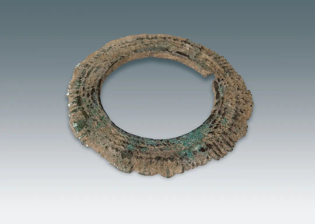 该地点出土绹纹环形器9件,这9件绹纹环形器的大小不同,直径最大11.4厘米,最小8—7厘米,厚2—0.3厘米,齿轮内圈稍厚,外圈为一轮齿状纹饰齿长0.6厘米,内纹有一小缺口,环口靠边沿有光滑处(铸口)齿状相连。古铜青色,环上两面各有5条绹纹。据出土文物的特征分析,为战国时期青铜制品,对其用途目前尚无定论。