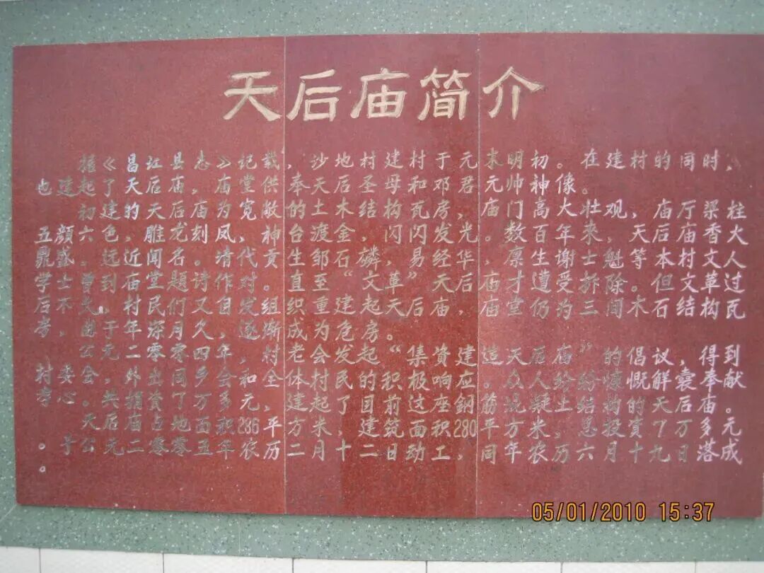 据《昌化县志》记载,天后庙建于元末明初,庙内存有据说是元代时的铁鞭2条,银鞭1条。现在的天后庙系沙地村民2005年在原址上重建。