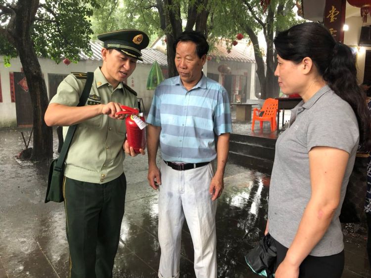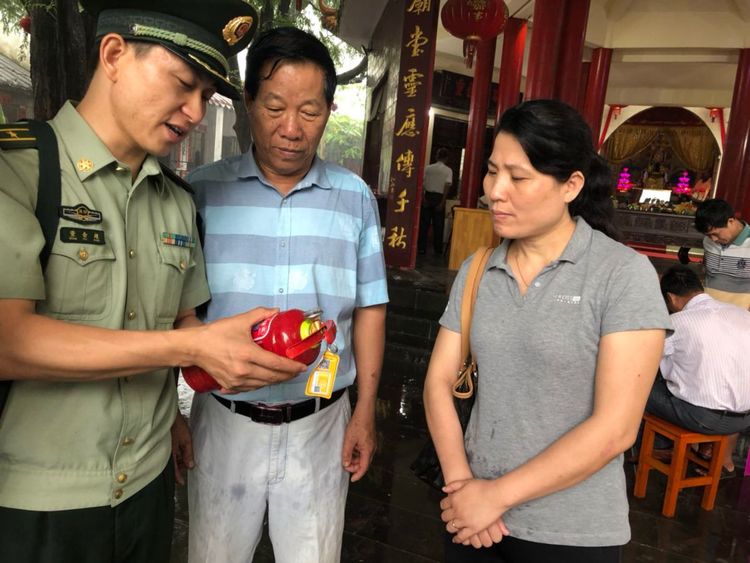 消防队员耐心地对峻灵王庙管理人员讲解灭火器的使用方法